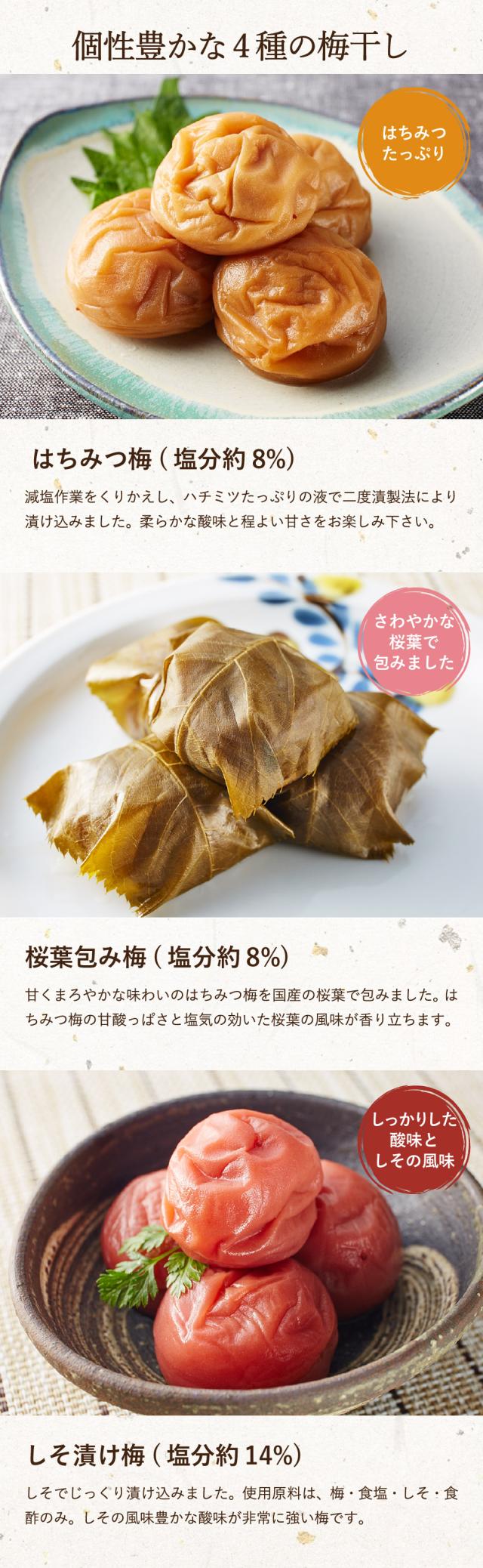 ●内容:昆布包み梅、しそ漬け梅、青紫蘇包み梅、はちみつ梅、各4粒、計16粒
