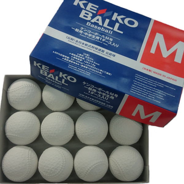 ナガセケンコー 軟式野球ボール M号 一般・中学生向け 検定球(12個入り)樹脂成分配合の変更で従来のボールより少し硬めです。ボールの弾み方はあまり弾まなくなっております。縫い目の数が増えてます。サイズはA号と同じ72±0.5mmで重さはA号よりも2g重い138±1.8gです。B号に比べると大きさ2mm、重さ3g大きくなります。B号使用の中学生にはボールが大きく、重く感じられます。