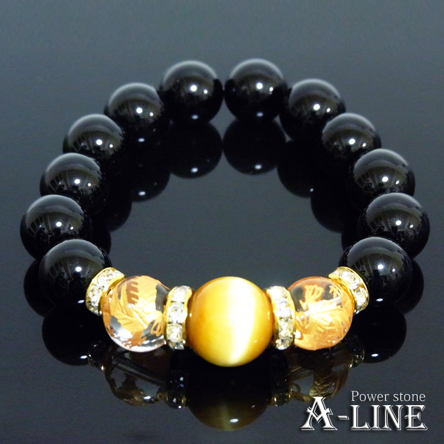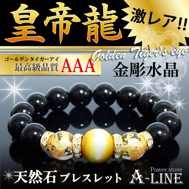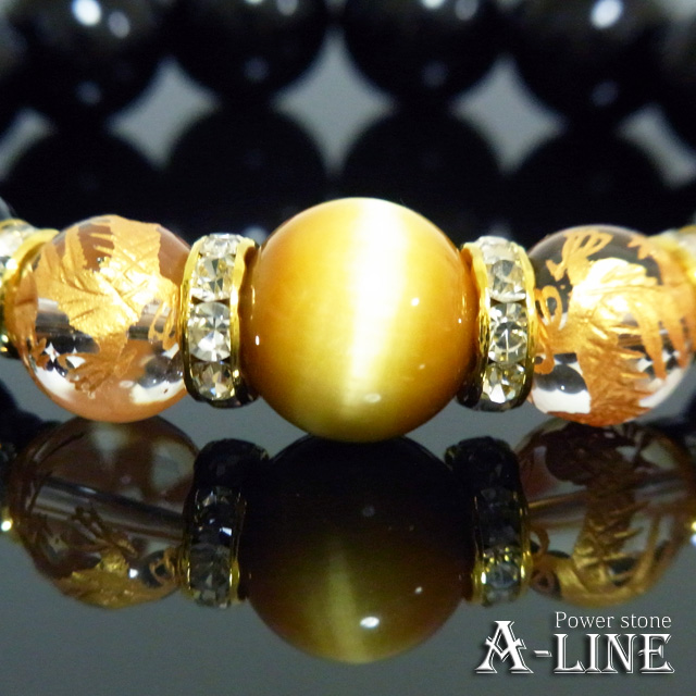 AAAゴールデンタイガーアイ14mm・金彫り皇帝龍水晶&オニキス12mm合金クリスタルロンデル・国産高級オペロンゴム