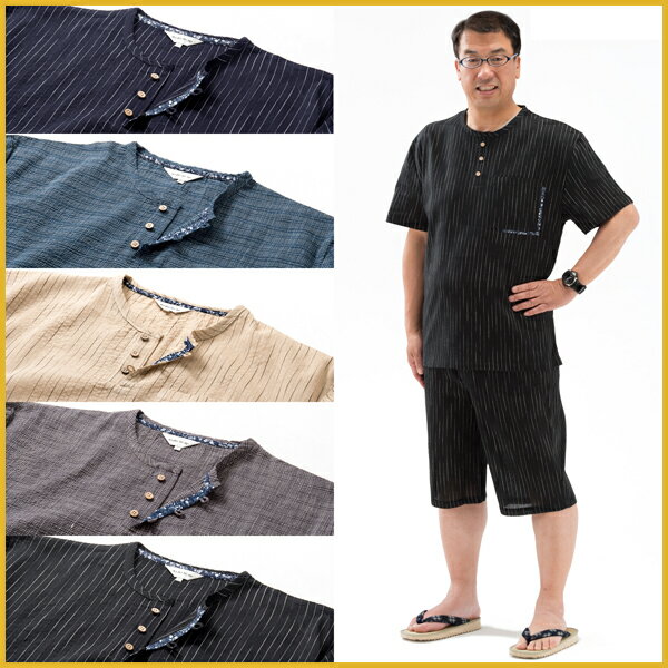 甚平素材の ヘンリーシャツ+半ズボン 甚平シャツセット ベージュ かすり縦縞&小格子の7色 父の日お誕生日