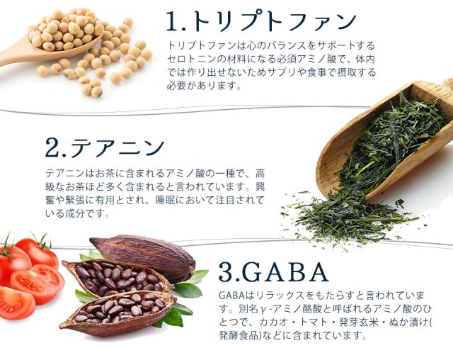還元麦芽糖(国内製造)、GABA/グリシン、トリプトファン、テアニン、ビタミンB2
