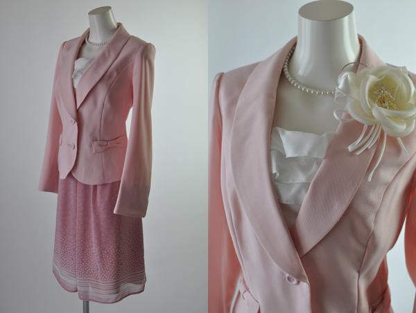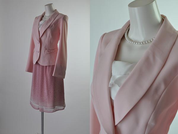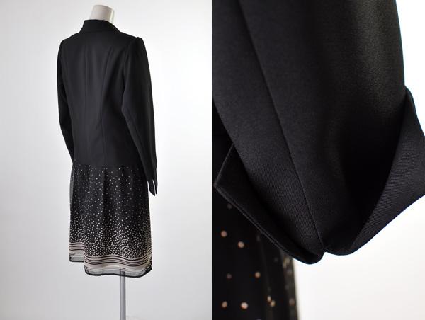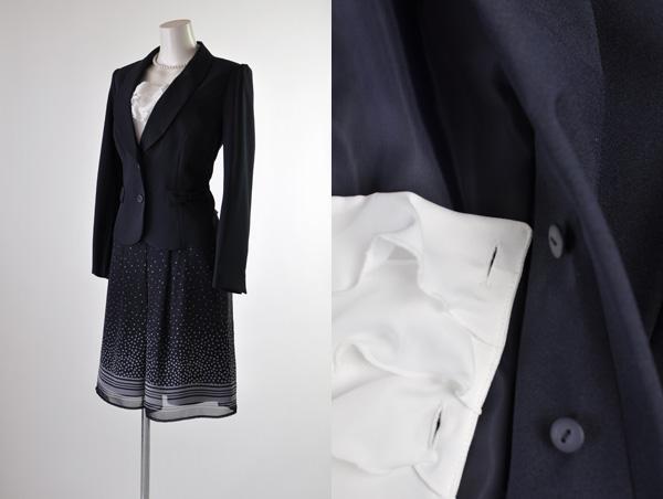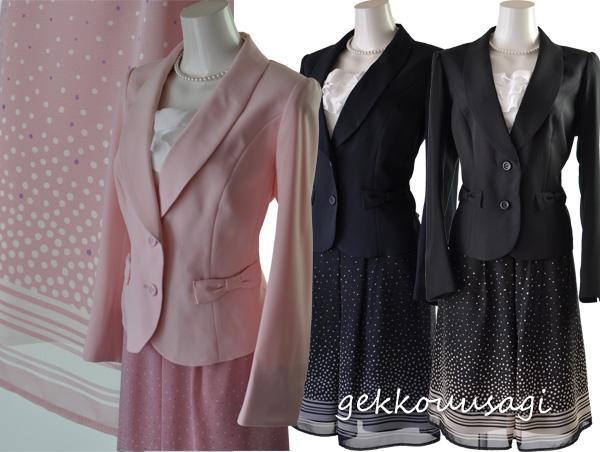 訳あり 15号〜38号 トールサイズあり リボン形ポケットジャケット プリントシフォンスーツ 紺 黒 ピンク 012-013