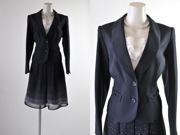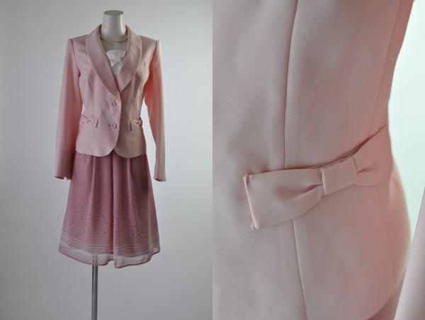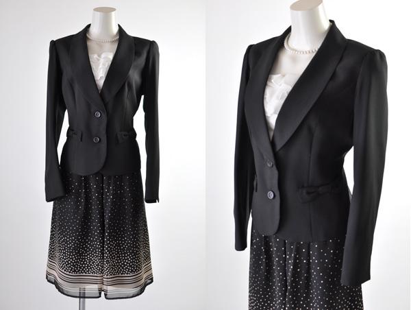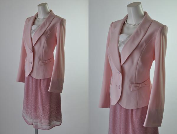 ジャケットはリボン形ポケットがキュート。肩パッド入り、袖口スリット入り。袖を折り返してお召しになれます。画像の胸当てはボタンで取り外し可能。