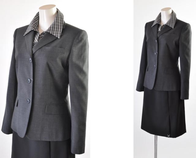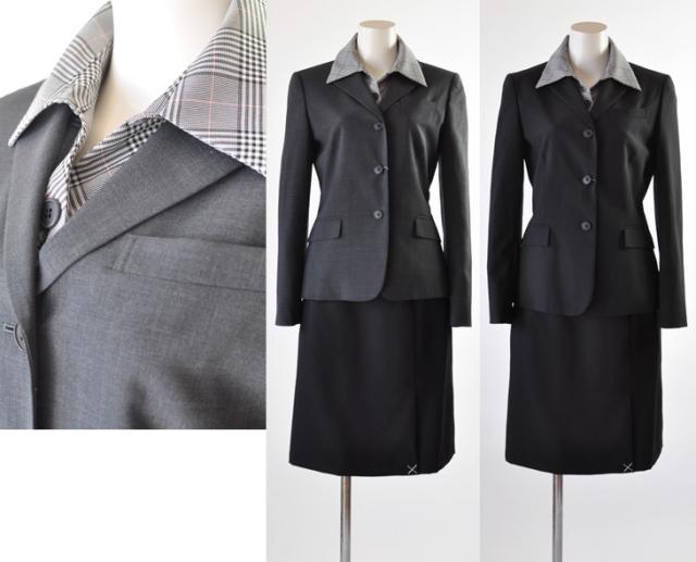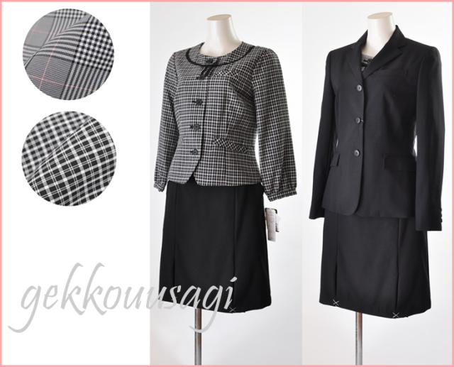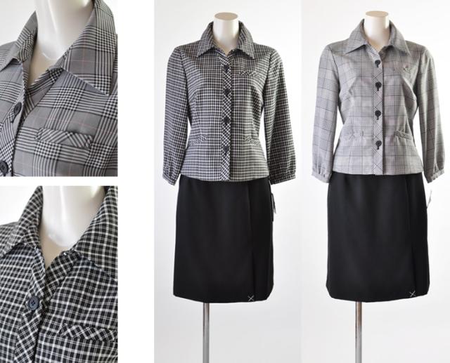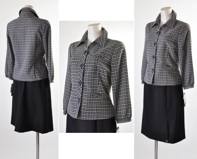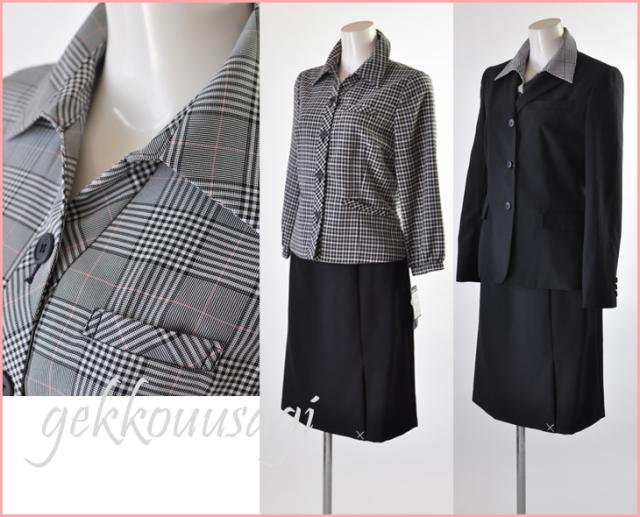 襟付き七分袖ジャケットのスカートは左前プリーツスカート、丸首ノーカラー七分袖ジャケットには前2つプリーツのスカートがセットになっています。