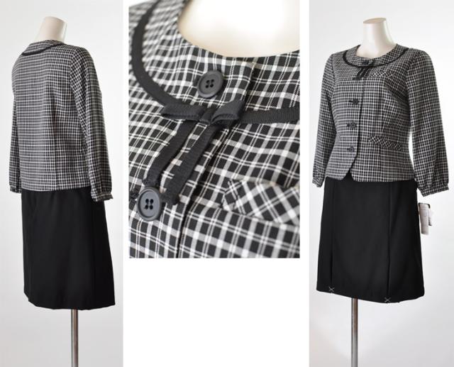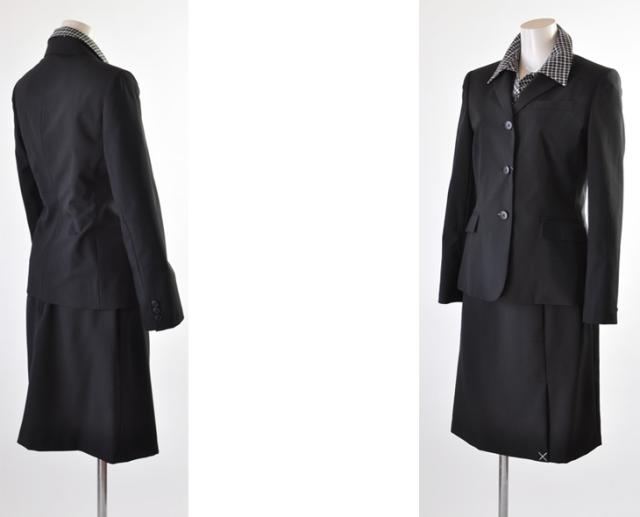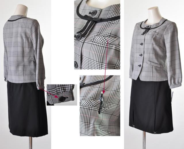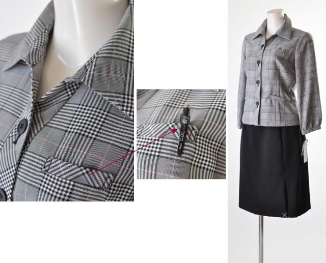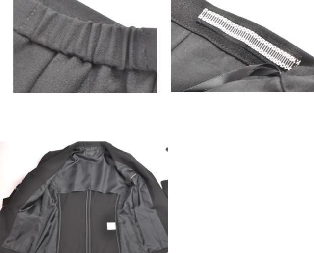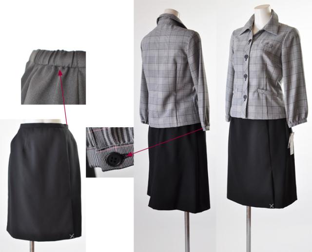 ジャケット裏地は背抜き・スカートゴム入り、ブラウスずれ防止テープ