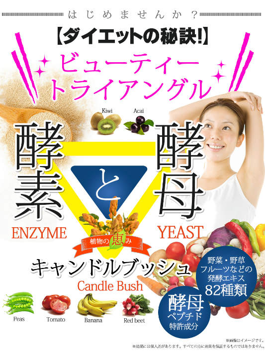 キャンドルブッシュ、植物発酵末(デキストリン、果実・野菜類、穀物類、野草エキス、糖類、海藻 類)、酵母ペプチド、セルロース、ショ糖脂肪酸エステル、微粒酸化ケイ素、原材料の一部にオレンジ、バナナ、リンゴ、キウイフルーツ、大豆、カシューナッ ツ、ゴマを使用しています