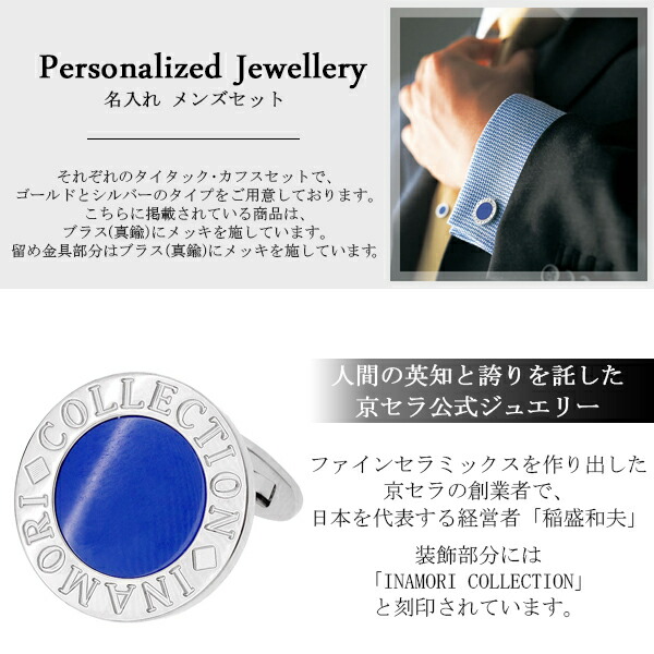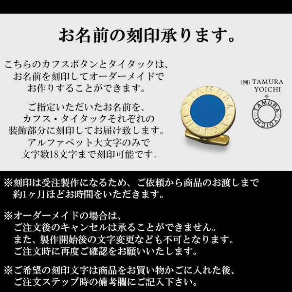 こちらのカフスボタンとタイタックは、お名前を刻印してオーダーメイドでお作りすることができます。