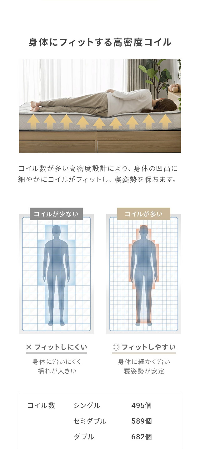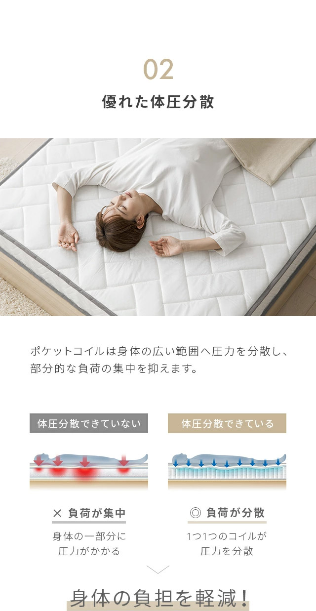 - ポケットコイルとボンネルコイルの2つでどちらがいいか悩んでポケットコイルのものにしました。大人が横になると体が沈みます。小学生の孫にはちょうどよい硬さなようです。ベッドも購入しサイズもちょうどよいのを...