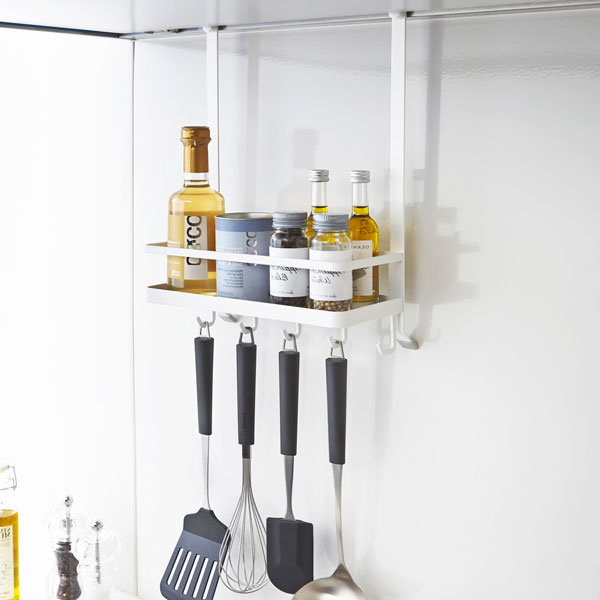 レンジフードに引っ掛けるだけで、スパイス類・調味料・調理道具の収納スペースに!