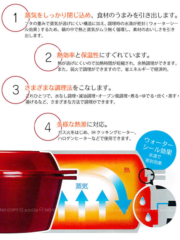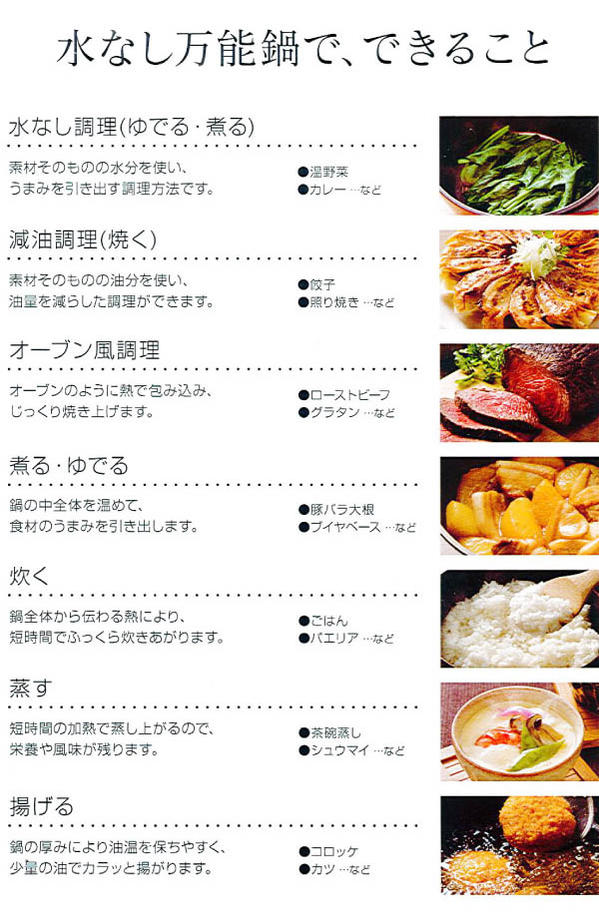 熱効率や保温性も高く、無水調理の他、煮る・焼く・炒める・炊く・蒸す・ゆでるなど様々な調理法に使えます。