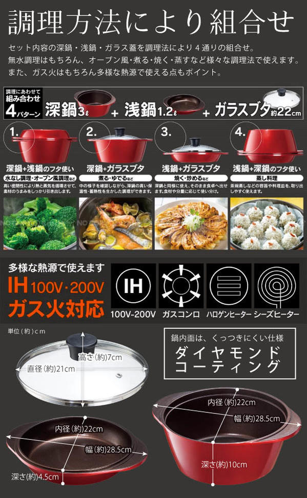 深鍋:(約)内径22×幅(持ち手含む)28.5×深さ10cm