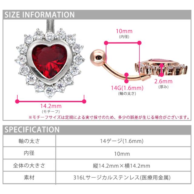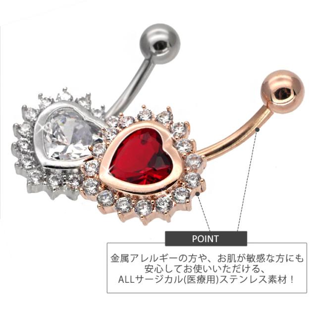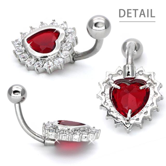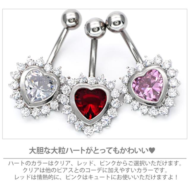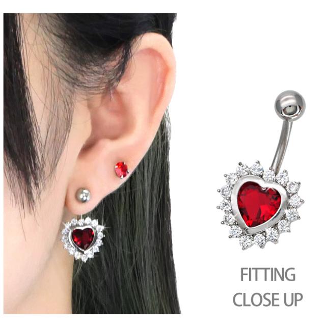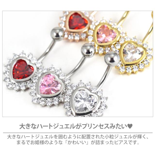 大きなハートジュエルをかこむように配置した小粒ジュエルがキラキラ輝く、まるでお姫様のようなとってもかわいいピアスです。おんなのこの「かわいい」が詰まったピアスです。へそピアスにはもちろん、耳の軟骨ピアスでも活躍するアクセサリーです。ハートのカラーはクリア、レッド、ピンクからご選択いただけます。ピアスの材質には、金属アレルギーにも安心の医療用素材”316Lサージカルステンレス”を採用しています。太さのサイズは一般的なへそピアスに使用される14Gサイズです。