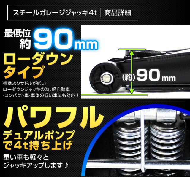\累計100万台突破/ ガレージジャッキ 低床 フロアジャッキ 4t ジャッキ 油圧 ローダンウンジャッキ 油圧ジャッキ ジャッキ デュアルポンプ式 ローダウン 車 タイヤ交換 マフラー交換 オイル交換 ホイール交換 重量車 大型 自動車整備 送料無料