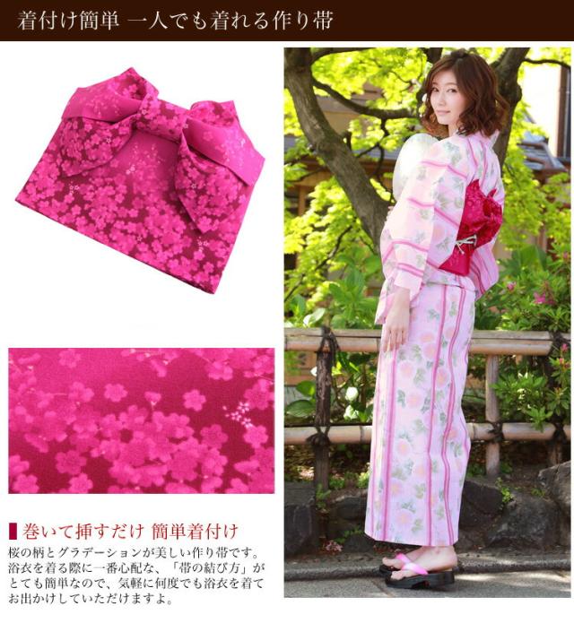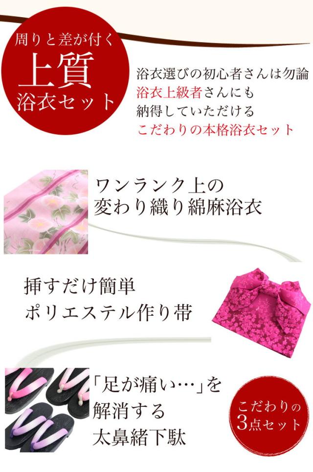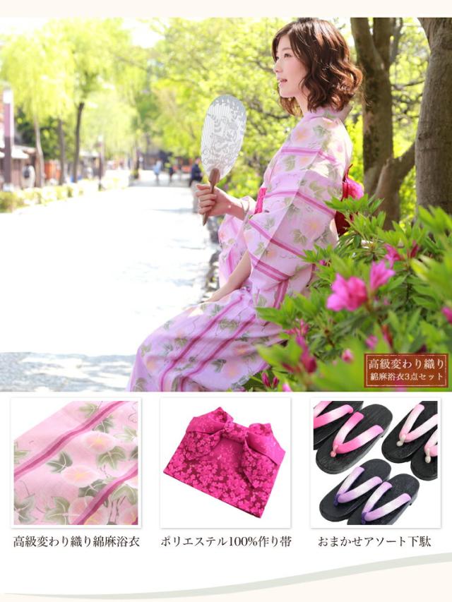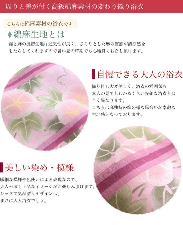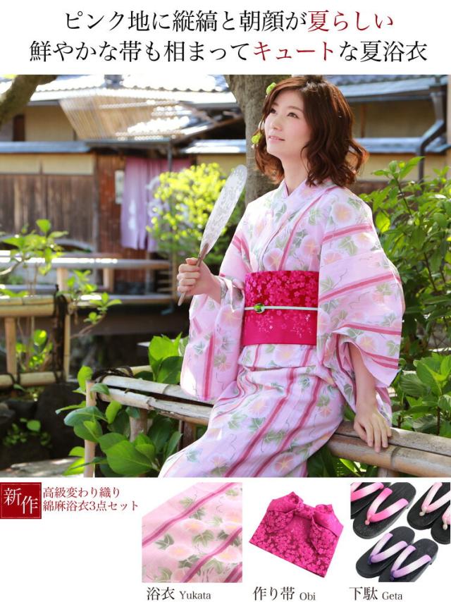 浴衣 セット 作り帯 レディース レトロ キュート フェミニン 高級変わり織り綿麻浴衣3点セット「ピンク地にピンク縞と朝顔」 浴衣 古典 花柄