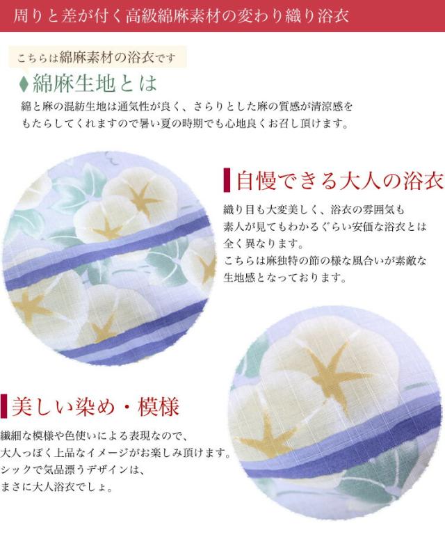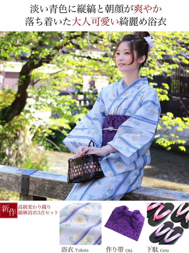 浴衣 セット 作り帯 レディース レトロ 大人 高級変わり織り綿麻浴衣3点セット「淡い青地に青縞と朝顔」 浴衣 ストライプ 水色