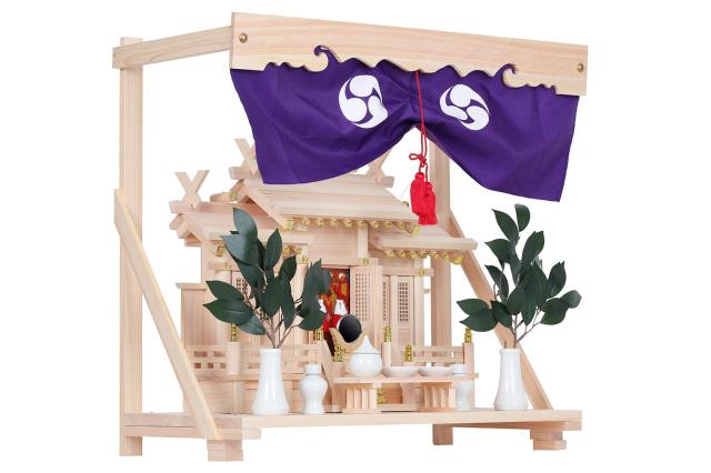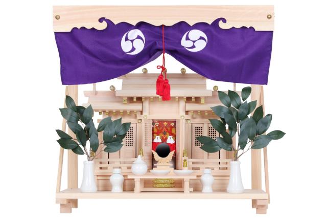 神具には滑らかな質感の国産「せともの」高級陶器が付属しています。八足台にお供えを添え、丁寧にお供えをいたします。棚板には美しいお宮を引き立てる「幕板・神幕」が付属。