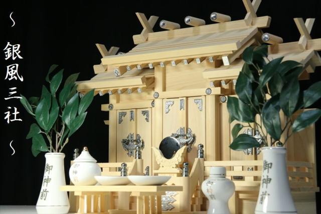 三社■屋根違い■■銀風三社■■神棚セット 最高級 神具セット付