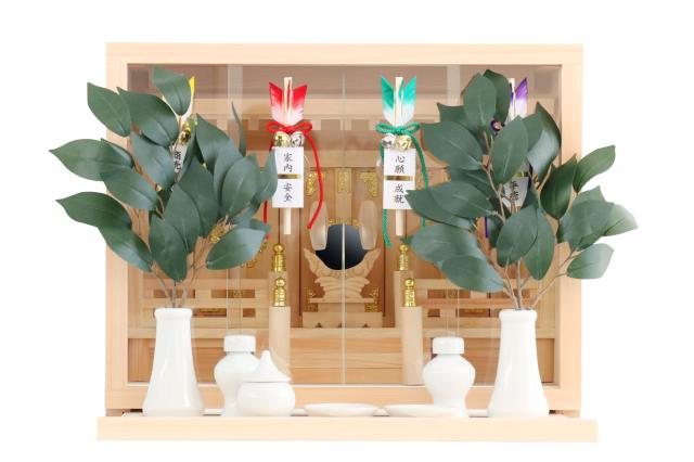 引出しがあり、神具一式もしっかりと設置できます。初めて神棚をお祀りされる方にも一押しの、小型オールインワンセットです。お札のお部屋は三社一部屋タイプ。