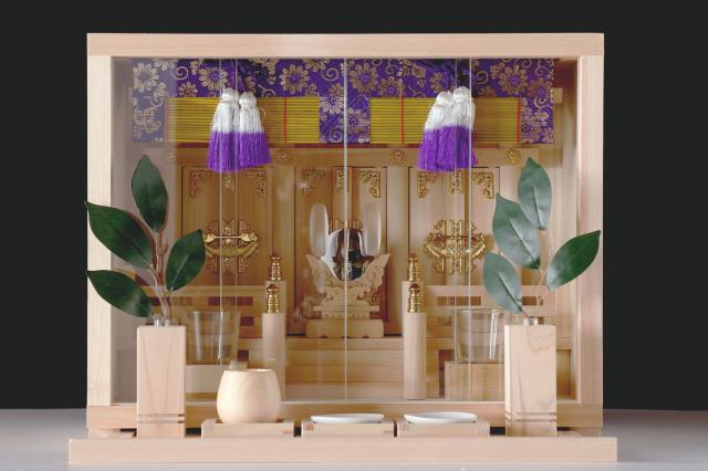 お御簾とガラス引戸で飾られた、とても上品な箱宮です。東濃ひのき製の良質な材を使用した、丁寧な仕上がり。