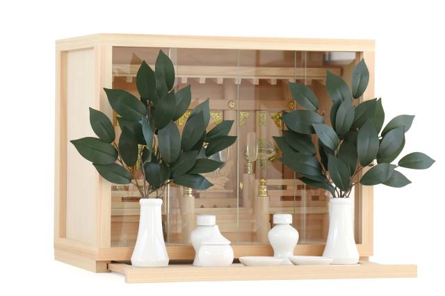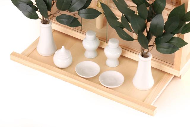 引出しがあり、神具一式もしっかりと設置できます。初めて神棚をお祀りされる方にも一押しの、小型オールインワンセットです。
