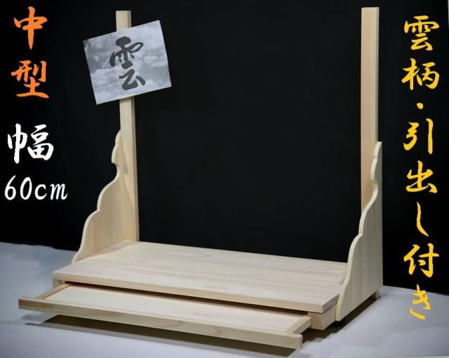 総ひのき製、膳引き(引き出し)構造の棚板です。引き出しは大き目のお供え物を置きたい時、また狛犬や灯篭、鳥居などの装飾品を飾る際にも便利です。側面の板は雲を表現した「雲柄」入り。横から眺めたお宮の雰囲気づくりに一役買ってくれます。1.5センチの厚板を使用したしっかりとした造り、棚板にも高級感をお求めの方にお勧めの製品です。 備考--- サイズ 約(cm)■棚板外寸の大きさ幅61 奥行32 高さ60■引き出し手前 17