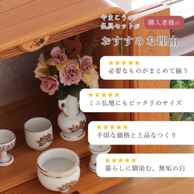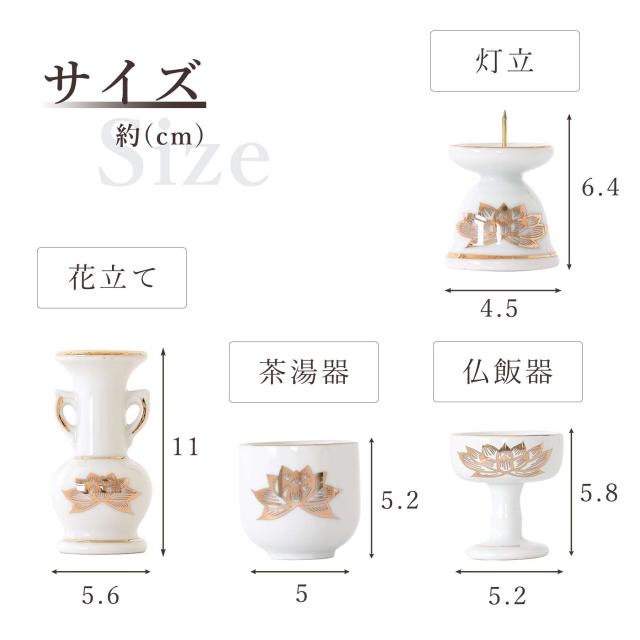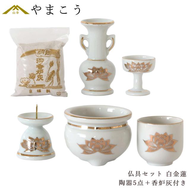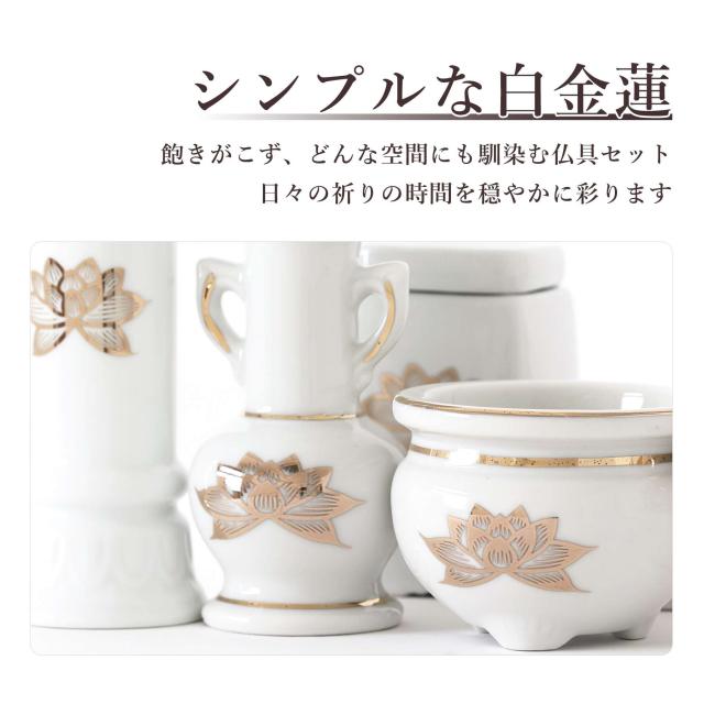 仏具 セット 陶器5点 (白 金蓮 ホワイト キンハス) + 香炉灰 仏具セット おしゃれ モダン 国産 日本製 仏壇セット モダン仏具 モダン仏壇 お盆 お彼岸 お墓参り お供え 供養 法事 法要