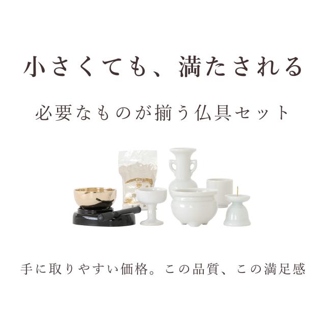 必要な仏具がすべて揃い、香炉灰・おりん3点セットも付属。