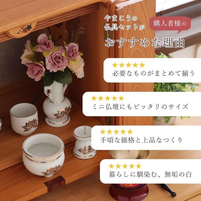 仏具 セット ミニ おりん 4点+陶器5点(白 金蓮 ホワイト キンハス)+香炉灰 仏具セット おしゃれ モダン 国産 日本製 仏壇セット モダン仏具 モダン仏壇 お盆 お彼岸 お墓参り お供え 供養 法事 法要
