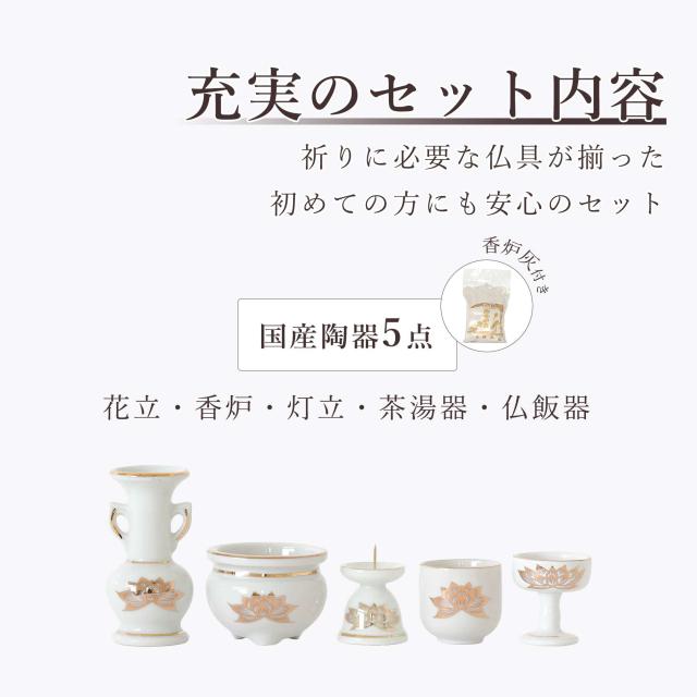 白無地に金蓮の柄が美しい国産陶器の仏具セット。