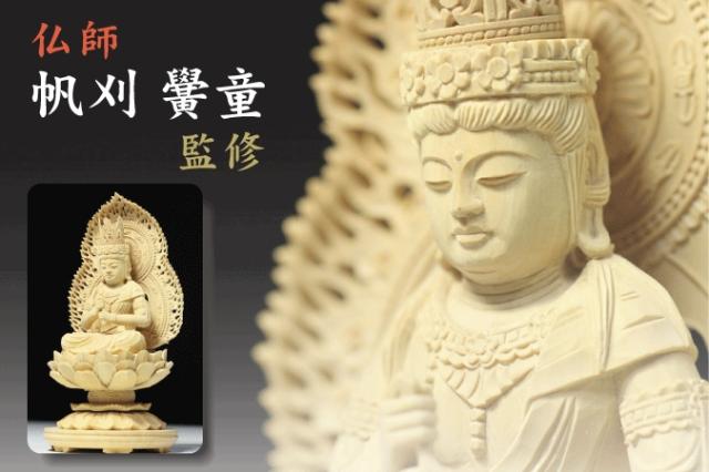| 大日如来像 火焔光背 蓮華座 総柘植 真言宗 御本尊 2寸 大仏師 帆刈黌童(ほかり こうどう)監修のご本尊シリーズ。硬質で淡い光沢、繊細な仕上がりが魅力の柘植材。一木造りの高級お仏像、モダン仏壇やミニ仏壇にもご安置しやすい大きさ、各宗派をご用意しております。 木彫像に寄せる大仏師の想いと共に、職人による丁寧な仕上げが一体ずつ施されています。優しいお顔の仏様、安らぎと平穏を享受し故人への感謝をお祈りいたします。 仏身の台座、蓮華座(丸台座)は仏様の優しいイメージをそのままに柔らかな曲線美、満開の蓮の彫刻。反り返った花びらを重ね合わせた、とても手の込んだ造りとなっています。仏身から放たれる一丈光の光背もまた、細部まで彫り込まれた職人の仕上がり。 天然木素材で作成されているため、木目や色合いに個体差がございます。年月の経過とともに飴色になり、仏像独特の風合いが出てまいります。 お届け当初の木目や色合いは目立たなくなりますのでご承知ください。 お仏像は仏壇中央にある須弥壇の上に安置いたします。ご購入の際は事前に奥行、天井までの高さをご確認ください。 帆刈 黌童 <大仏師・名古屋市> ■主な作品 平成 9年 鎌倉長谷寺より仁王像修復 大善寺(東京) 平成10年 日蓮聖人像 瑞光寺(東京) 平成11年 弥勒菩薩像 開法寺(北海道) 平成11年 烏枢沙摩明王像 開法寺(北海道) 平成12年 弘法大師像 成田山深川不動堂(東京) 平成12年 聖徳太子考養像 成田山深川不動堂(東京) 平成14年 大日如来像 成田山深川不動堂(東京) 平成17年 仁王門仁王像 弘誓寺(宮城) 平成17年 如意輪観音像修復 安養寺(宮城) 平成23年 不動明王 座像一丈八尺 成田山深川不動堂(東京) 平成24年 池上本門寺御本尊 日蓮大聖人模刻 法妙寺(長崎) | |||