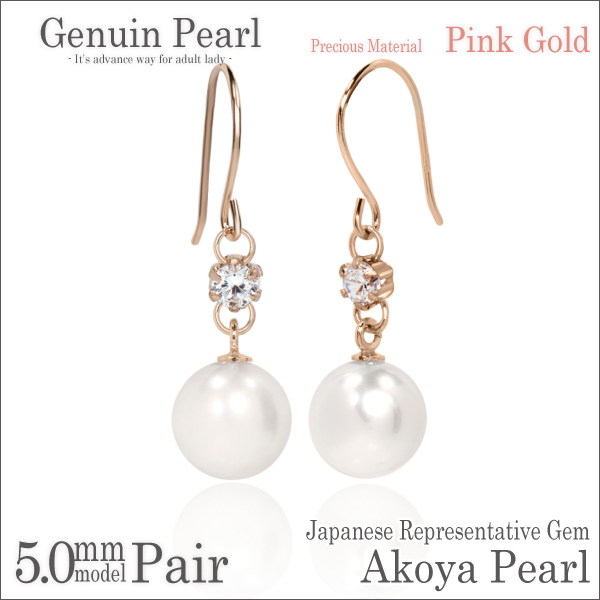 送料無料 K10 ピンクゴールド 本真珠 アコヤパール 5mm 珠 脇石キュービックジルコニア フック ピアス 両耳ペア