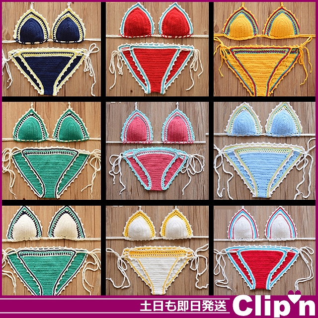 メール便/送料無料 ハンドメイド クロシェ ビキニ 上下 セット M フリー 裏地 ブラパッド付き水着 即納即日発送あす着