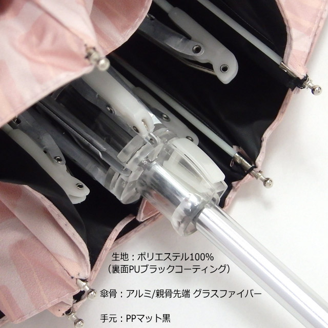 ■素材:生地/ポリエステル100%、裏面/PUブラックコーティング、傘骨/アルミ・グラスファイバー、手元/PPマット黒