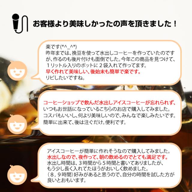 | こんな方にオススメです | 夏の暑さを和らげたい方:冷たい水出しコーヒーは、暑い夏の日にピッタリです。手軽に作れて、美味しく水分補給ができます。 簡単に美味しいアイスコーヒーを楽しみたい方:パックを水に浸けるだけで本格的なアイスコーヒーが作れるので、忙しい方や手軽に作りたい方に最適です。 家族みんなで楽しみたい方:大容量パックで家族全員が楽しめます。特に、家族でアイスコーヒーを楽しむ時間が増えます。 |