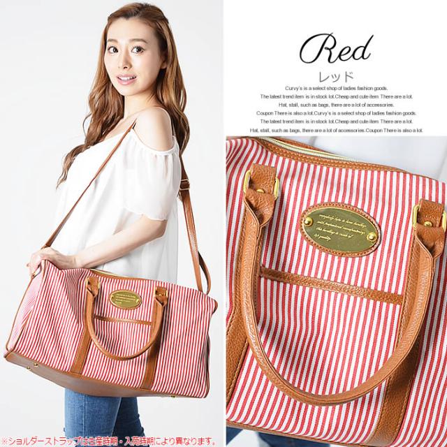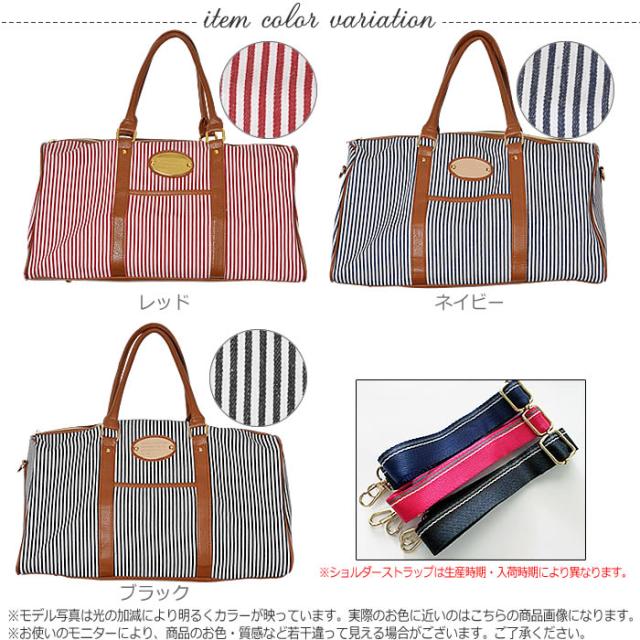 - 小さくもなくそれほど大きくもない、旅行カバンを探していました。希望通りの大きさで、2泊位は余裕そうです。マチが広いのと、底鋲がついているのが決め手でした。シンプルな物が好きなので、内ポケットが1つだけというのも良かったです。赤と白の細いストライプ柄が、とても可愛いです。手提げとショルダー、2通りの持ち方ができます。期待以上の商品で、良い買い物ができて、嬉しかったです。