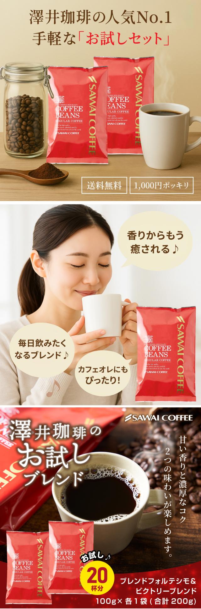 焙煎したて コーヒー豆 コーヒー粉 1000円ポッキリ 送料無料 メール便 澤井珈琲 少量お試しセット 【人気2種のレギュラーコーヒー飲み比べセット ブレンドフォルテシモ ビクトリーブレンド】 約20杯 1000円プレゼント