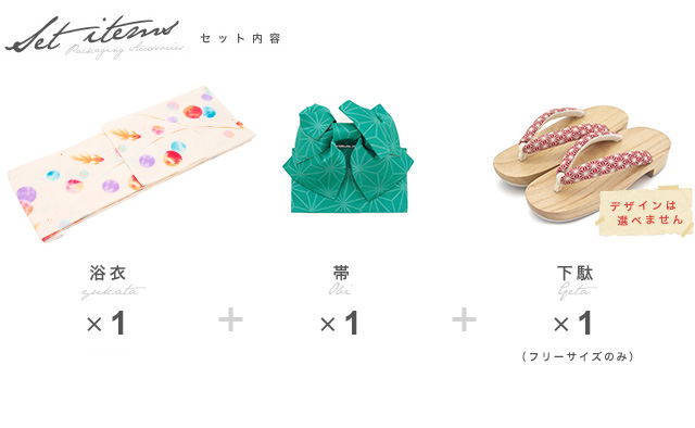 こちらの商品は、浴衣・帯・下駄の3点セットです。セット内容の一部変更や、それに伴う値引きは承っておりません。