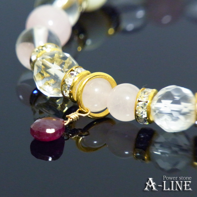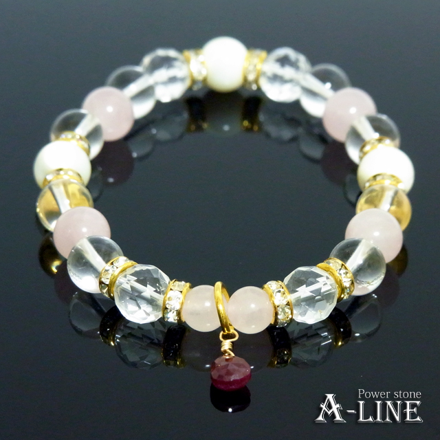 天然ルビー(ワイヤー)・ローズクォーツ&マザーオブパール&水晶&64面カット水晶8mm・ローズクォーツ6mm・合金ロンデル・国産高級オペロンゴム