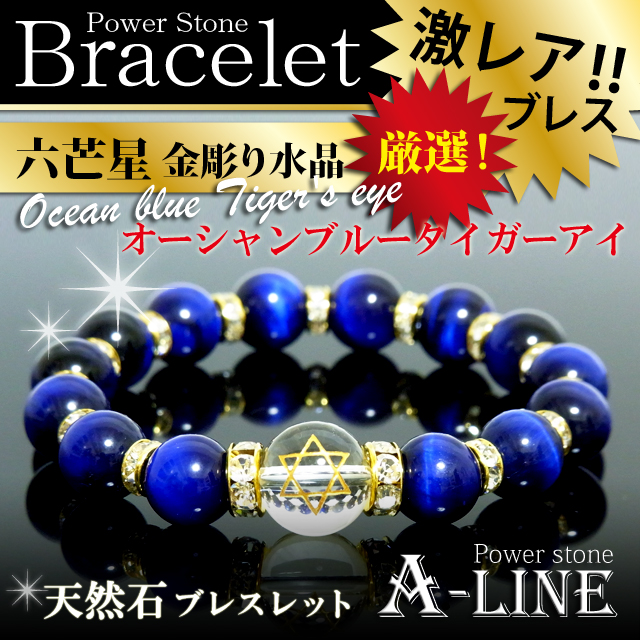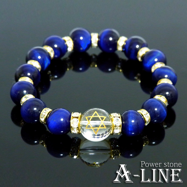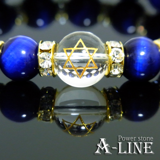 太古から宇宙のエネルギーを集約すると言われる【六芒星】を金彫りした水晶12mmを使い、世界三大金運石でのAAAオーシャンブルータイガーアイ10mmに更なるエネルギーを注入!