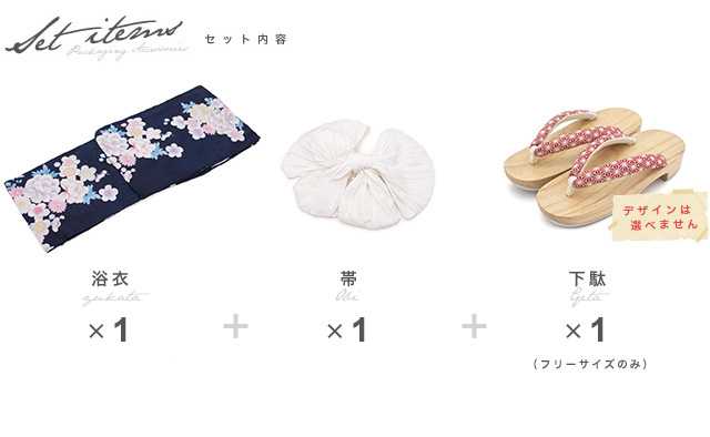 こちらの商品は、浴衣・帯・下駄の3点セットです。セット内容の一部変更や、それに伴う値引きは承っておりません。