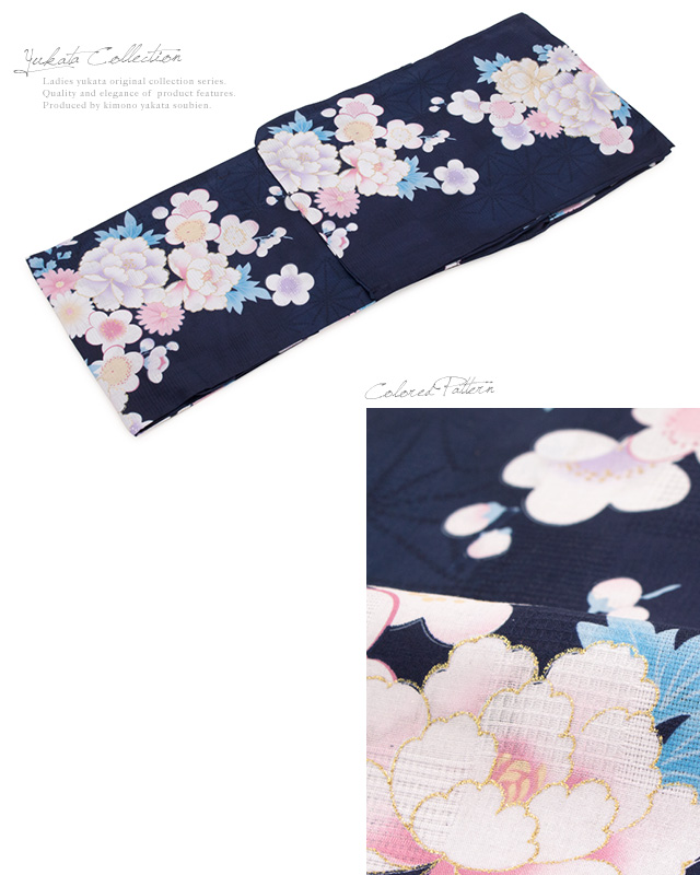 浴衣セット レディース レトロ 浴衣セット 大人 3点セット 紺系 ネイビー 白 牡丹 梅 麻の葉 花 綿 ラメ 兵児帯 女性 ボヌールセゾン