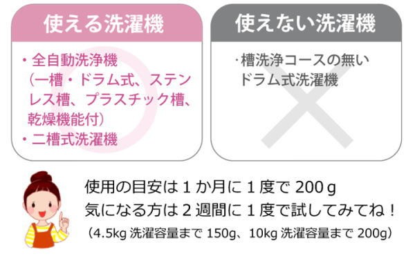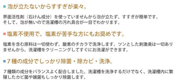 界面活性剤と塩素成分を一切使用していない、人にも環境にもやさしい洗浄剤!7種の配合成分でしっかり洗浄、同時に消臭。洗浄後に嫌な臭いを残しません。月に1〜2度の洗浄でカビの発生を抑え、清潔に保てます。【成分】過炭酸Na、珪酸Na、炭酸Na、クエン酸Na、ホウ素、ホタテ焼成カルシウム、たんぱく分解酵素【液性】弱アルカリ性【内容量】200g【使用量(1回分)】4.5kg洗濯容量まで150g、10kg洗濯容量まで200g