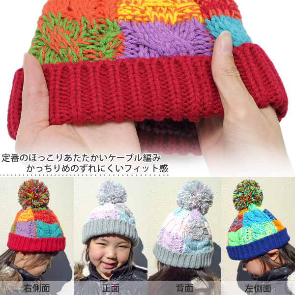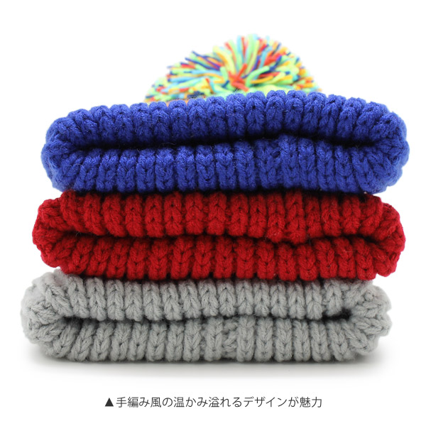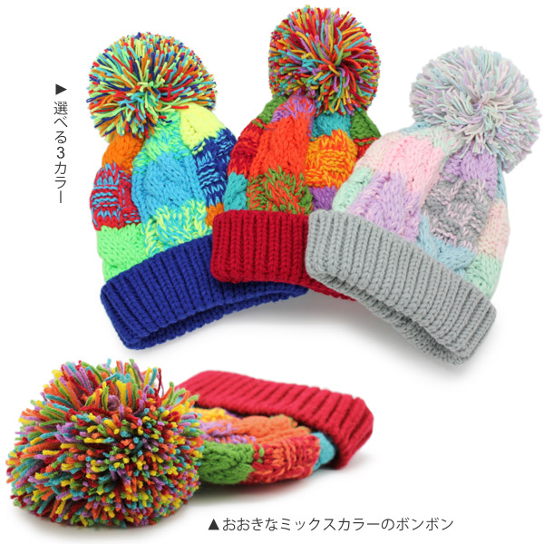 おおきなミックスカラーのボンボンがキュートなざっくりニット帽です。色がスクエア状に並んでいますので分かりにくいかもしれませんが、定番のほっこりあたたかいケーブル編みになっています。優しい雰囲気が魅力のパステル色と、はじける元気なカラフル色の2パターン。ふたつ持っていても全然違う帽子に見えますね。ゆるすぎない着用感なのでずれにくくオススメです。