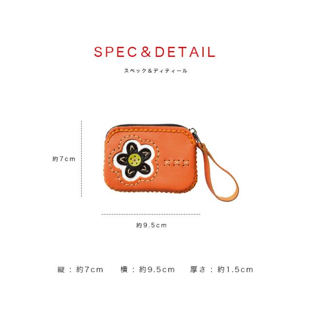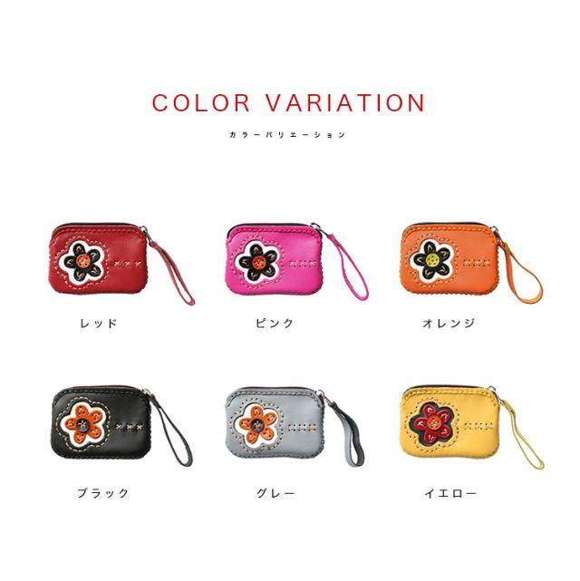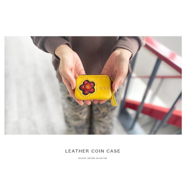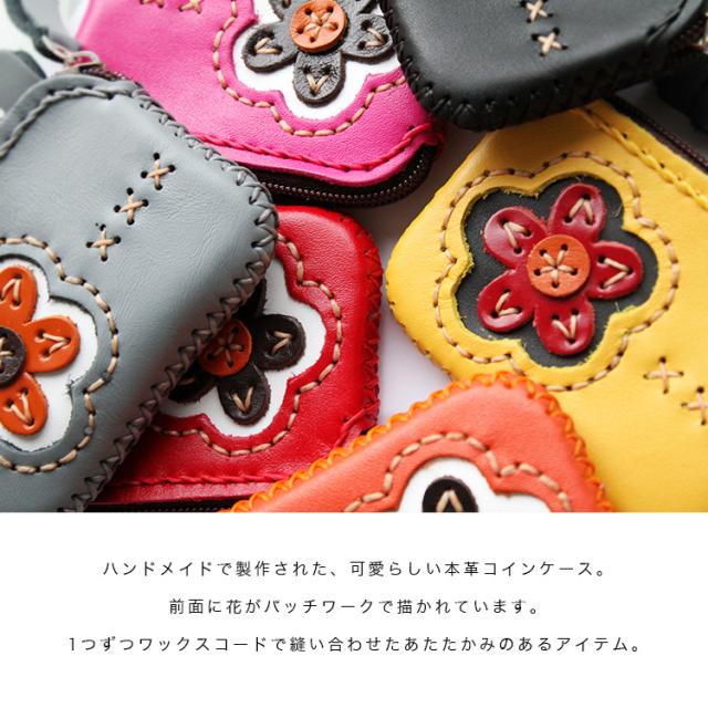 牛革を使用してハンドメイドで製作したコインケースです。前面に花がパッチワークで描かれており、ワックスコード縫いで温かみのあるデザインに仕上がっております。※手作りでの製作のため花の色合いや形状が多少ことなる場合がございます。