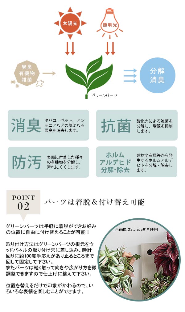 日本製/完成品/壁掛け用フック2個付属/ウッドパネル取り付け穴8個/グリーンパーツ6個付属/グリーンパーツは着脱・付け替え可能/ラッピング不可