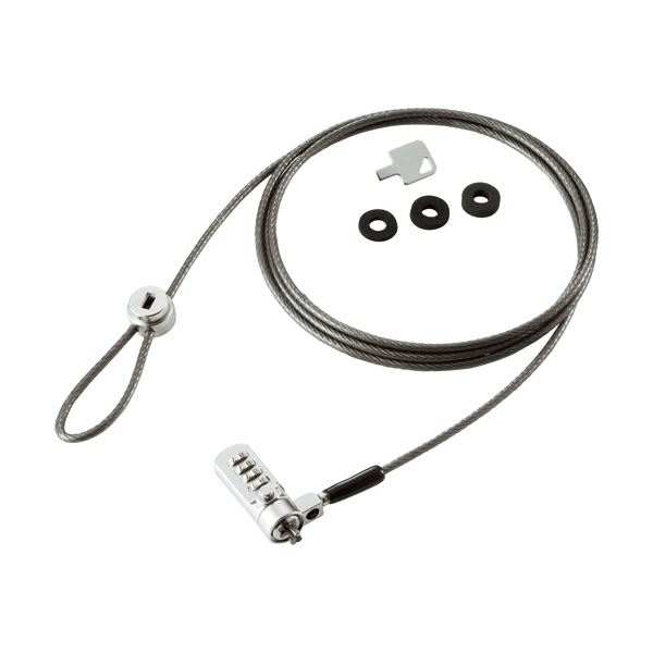 錠タイプ:ダイヤル錠式ロック ワイヤー径:4mm ワイヤー長:2m 錠部サイズ:W49×H28×D19mm(突起物を除く) 材質:ワイヤー:スチール、皮膜:PVC、設定キー:スチール(メッキ処理)、スぺーサー:ウレタン その他仕様:●適用機種:ノートパソコン、デスクトップパソコン、周辺機器等(セキュリティスロットを有する機器) セット内容:本体×1、スペーサー×3、設定キー×1