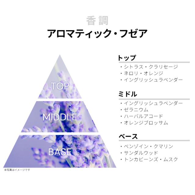 シトラス、クラリセージ、ネロリ、オレンジ、イングリッシュ・ラベンダーなどが、ナチュラルですっきりとしたシトラス・ラベンダーを香り立たせるトップから、
