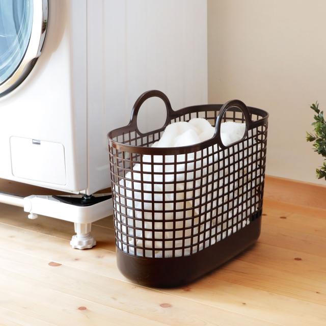 シンプルでナチュラルな雰囲気のソフトバスケットです。洗濯物入れやランドリー収納としてはもちろん、スリムな設計なのでハンガー入れとしても便利です。プラスチック素材で扱いやすく、格子状なので通気性も抜群です。