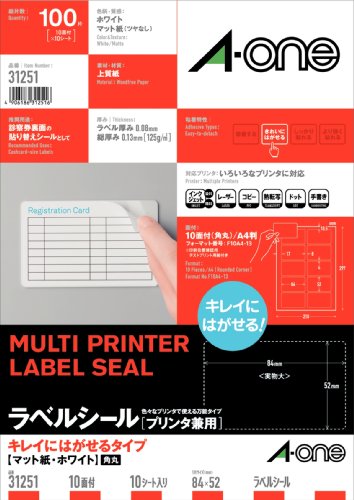 ●キレイにはがせるタイプ マット紙・ホワイト/材質:上質紙/標準総厚み:125g/m2(0.13mm)/ラベル厚み:0.08mm●A4判 10面 四辺余白付 角丸/シートサイズ:A4判(210mm×297mm)/ラベルサイズ:84mm×52mm(2列×5段)●対応プリンタ:インクジェット(染料・顔料) レーザー コピー 熱転写 ドット 手書きいろいろなプリンタで印刷できるマルチタイプのラベルです。ピッタリ貼れてスッキリはがせる再はくりタイプです。IDカードの作成や診察券の更新に便利です。 / ■入り数:10シート(100片)■面付き:10面■面付き:84×52mm■素材:上質紙■厚み:125g/m2(0.13mm) ■シートサイズ:A4判 (210×297mm)■対応プリンタ:・インクジェット・カラーレーザー・モノクロレーザー・モノクロコピー■用紙特性:・マット・キレイにはがせる■顔料インク:対応 /▲メーカー直送品▲代金引換不可▲ラッピング不可