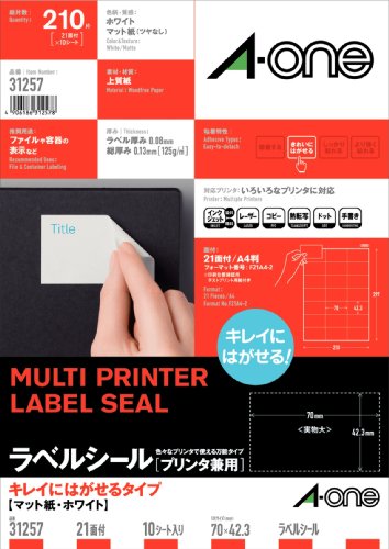 ●キレイにはがせるタイプ マット紙・ホワイト/材質:上質紙/標準総厚み:125g/平方m(0.13mm)/ラベル厚み:0.08mm●A4判 21面/シートサイズ:A4判 (210mm×297mm)/ラベルサイズ:70mm×42.3mm(3列×7段)●対応プリンタ:インクジェット(染料・顔料) レーザー コピー 熱転写 ドット 手書き◆備品管理・価格表示・バーコード印刷などに最適なサイズです。 ◆様々な種類のプリンタで使えるため、オフィスだけでなくご家庭でもご利用いただけます。 ◆はがしてものり残りしないので、一時的な表示にも便利です。 / ■ 仕 様 ■入数:10シート(210片)面付き:21面(3列×7段)一片サイズ:70×42.3mm 素材:上質紙厚み:125g/m2(0.13mm)シートサイズ: A4判 (210×297mm)用紙特性:マット紙 キレイにはがせる / プリンタ適性・インクジェット(染料・顔料) ・カラーレーザー ・モノクロレーザー・モノクロコピー・熱転写・ドット